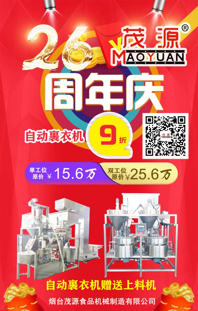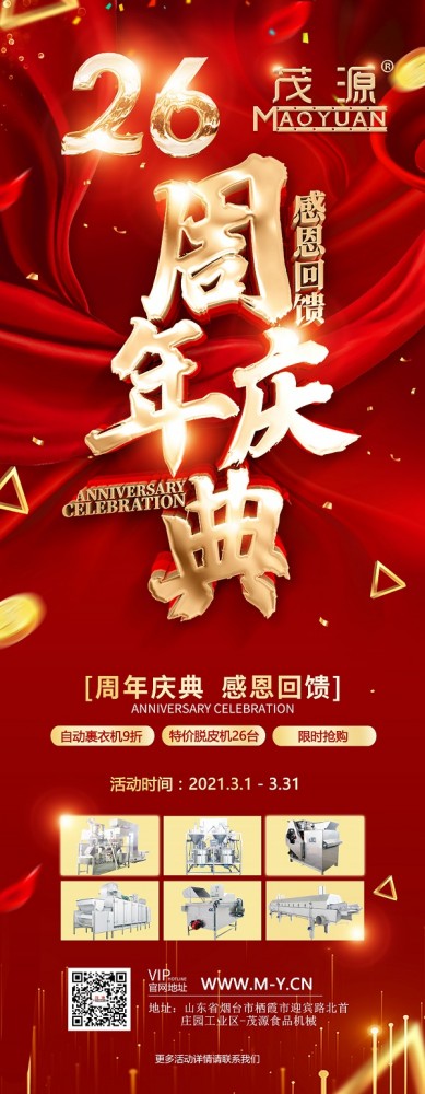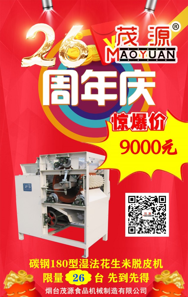 煙臺(tái)茂源食品機(jī)械即將迎來26周年慶,為感謝新老客戶長(zhǎng)期以來的支持與信任,現(xiàn)特推出以下感恩回饋活動(dòng):?jiǎn)喂の?、雙工位自動(dòng)裹衣機(jī)原價(jià)15.6萬元、25.6萬元基礎(chǔ)上降價(jià)10%,并隨機(jī)贈(zèng)上料機(jī);碳鋼180型濕法花生米脫皮機(jī)特價(jià)9000元,限量26臺(tái),先到先得!